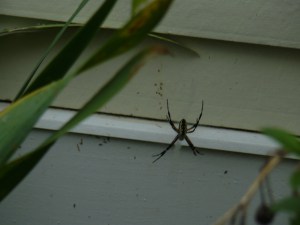 The other evening my family and I were having dinner at a local cafe. At one point, a large, undoubtedly female, and apparently, very pregnant, spider, dropped from the ceiling, and hung directly in front of our most savvy waitress. The waitress turned, picked up a glass and piece of paper, scooped up the spider, and deposited her outside. It was then that the young woman, apparently pregnant, seated at the next table, noted to her companion that the spider had quietly woven her into its web!