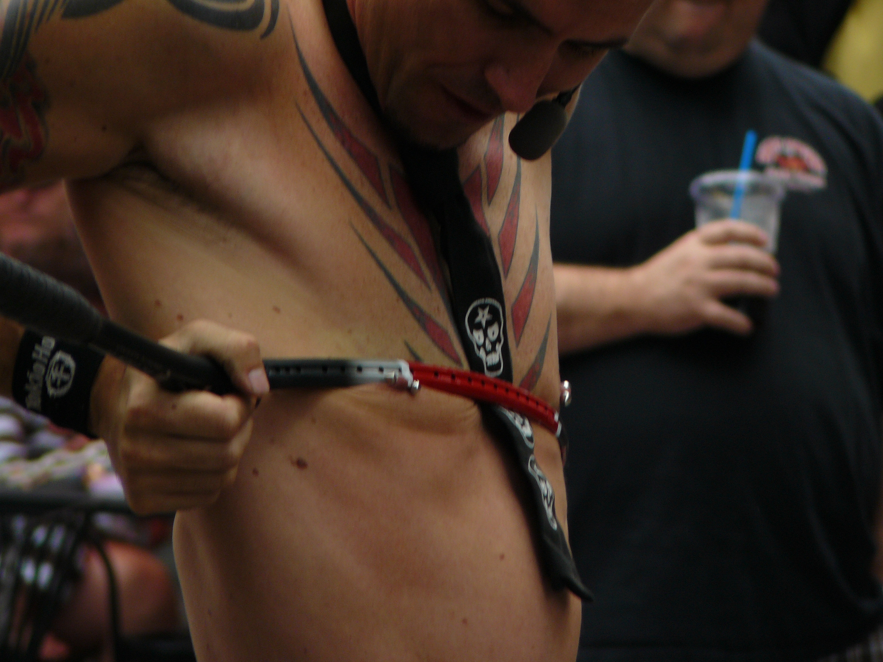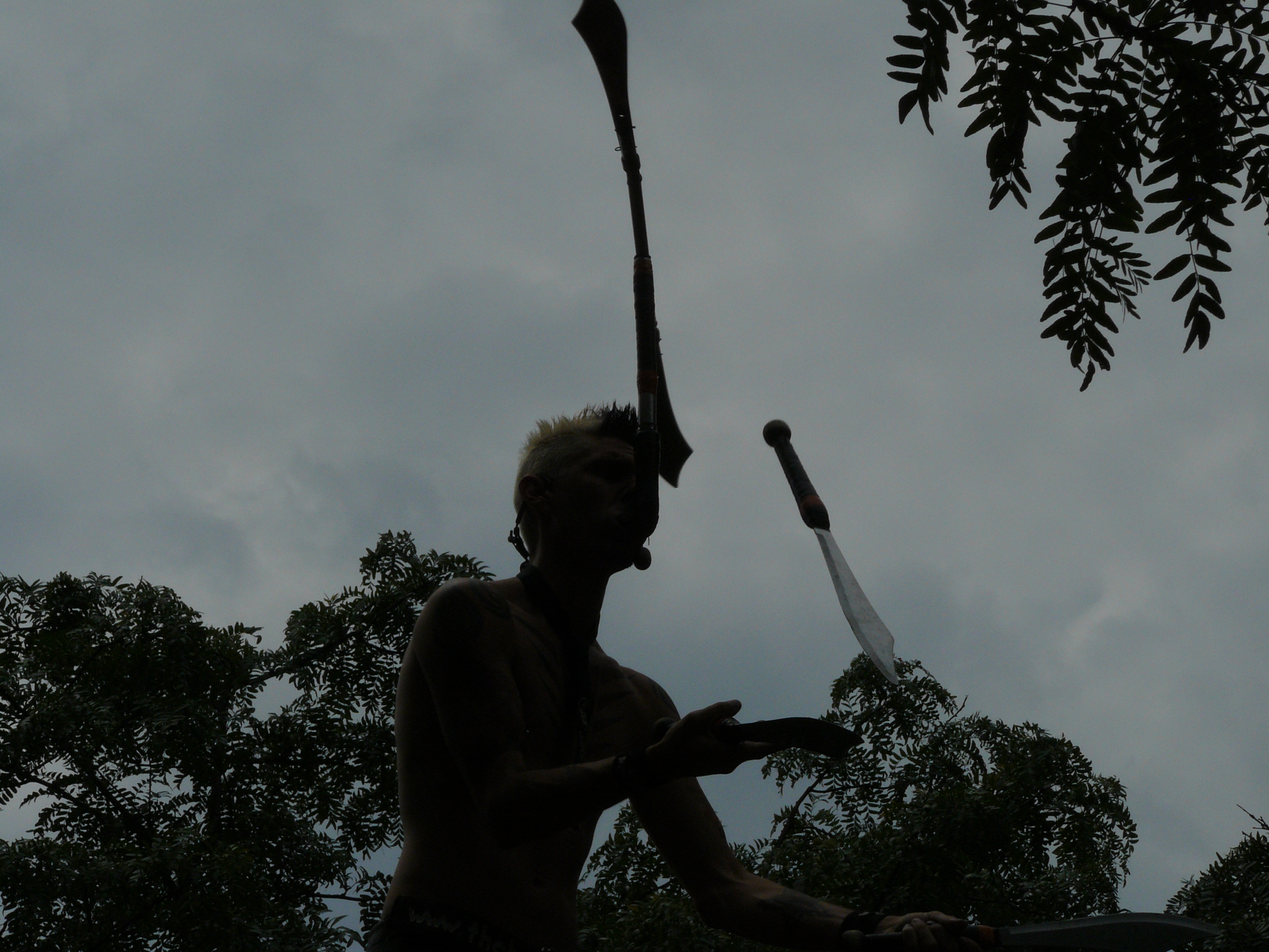 Alakazam, a juggler from Australia who advertises himself as “the human knot,” due to his abilities as a contortionist, played the crowd perfectly. His patter was filled with sexual innuendo, his tricks looked dangerous, and his smile was infectious. Although covered by tattoos, he was Everyman. Although clearly very intelligent, he was the Fool. In short, he was an exceptional clown!