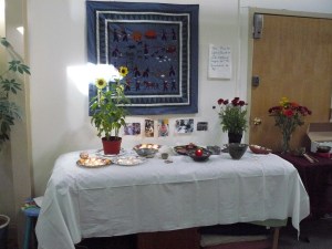 Saturday, as part of Art Hop, we held a brief Ceremony of Remembrance for all people around the world impacted by the events of 9-11-01. Throughout the day visitors added candles and written prayers to the altar, and made prayer flags. Last night we put out the flags, and held a fire ritual to release the written prayers to the Creator and the Helping Ones.