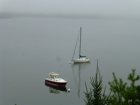 At the moment I am without internet, although my cell phone rang a few minutes ago, which probably means I could check e-mail if I were so inclined. The truth is since I have a very simple phone, doing so would be painful and I am disinclined anyway. When the cell rang I was on the porch, try in vain to see the other side of the bay. Now the fog has lifted and the sun is making some effort to come out, the coffee is dripping, and Jennie’s blueberry muffins are cooling in the rack.