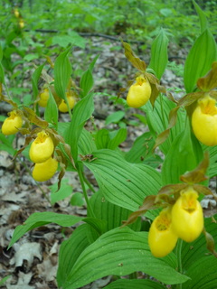 We just returned from a walk in the woods. Given I now wear a full length leg brace, going up and down hillocks is a growing challenge. In spite of this, we made it up to the ridgetop and walked for some time among columbine, pink and white trillium, and yellow lady slippers; the latter are arguably our showiest orchids, and are a joy to behold. In the forest the spring wildflowers seem to create communities of like-minded individuals, the more showy species seldom overlapping in the thick mats of plants that makeup the forest floor.