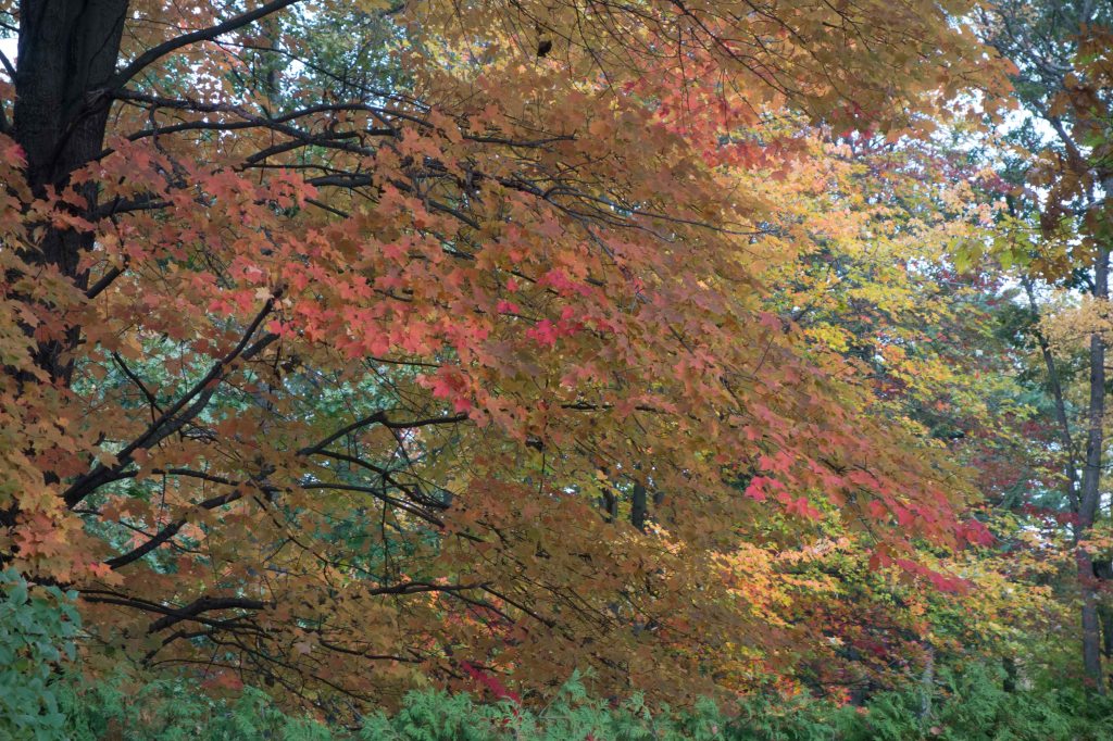 Leaf change here by the lake has followed the pattern of the past few years: reds early, then yellows and oranges taking over and predominating. The pace of change is wildly inconsistent, with some trees leafless while others have barely begun to turn; the landscape looks as though early October and Thanksgiving were occurring simultaneously.