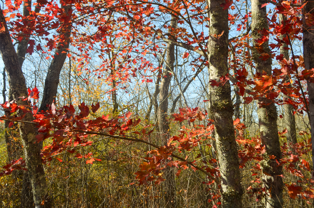 A bit further inland many trees are now bare, which accentuates the colours on those that have so far retained their leaves. The oaks, always the last to turn, are mostly greenish, although a few have put on their characteristic rich reds, maroons, and browns. As we move into November the maples and their ilk will drop their remaining leaves, giving the landscape an open, barren look, broken only by clumps of browning oaks.