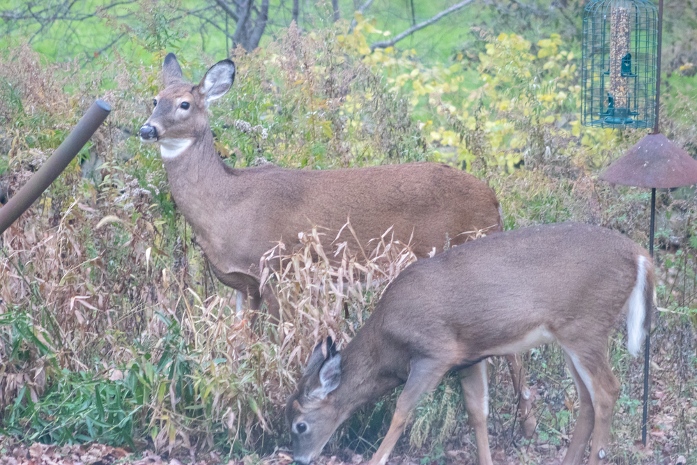 Just before three Jennie called up to me to look out the window by my desk. I saw nothing unusual so went down stairs where she pointed to two immature deer grazing happily twenty feet or so from our kitchen window. They had probably spent the day bedded down in our yard, as one was photographed by a friend as it stood near the kitchen door early in the morning