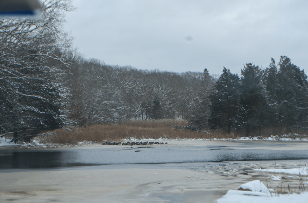 Sunday we awoke to several inches of snow so went for a drive. We discovered a large flock of mixed ducks on the tidal river. As we watched, an immense great blue heron flew in and landed not far from the van. I figure it may be one of the pair we saw this summer, as great blues are known to overwinter here. We tried to take photos but I had the wrong camera for the task….