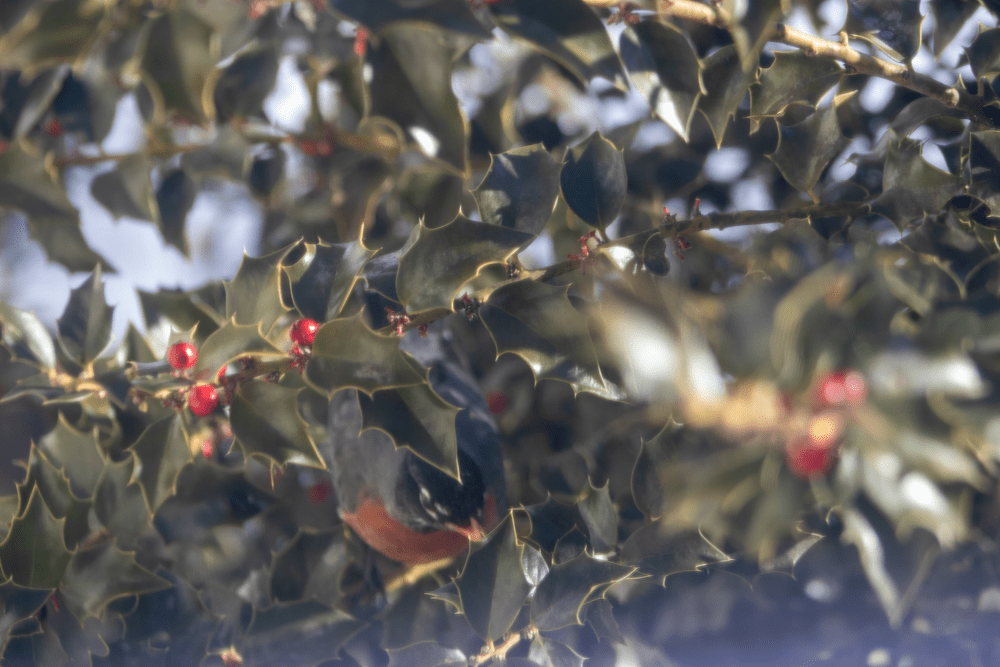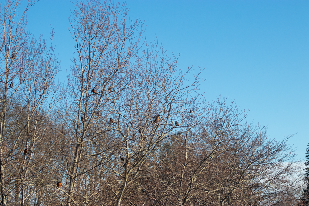 A couple of days ago a mixed flock, mostly robins, but also waxwings and starlings, set upon our large holly. It was a circus, enacted right outside our dining room window. Within a couple of hours the tree was bare of berries. I tried to find one lone surviving berry but there were none.